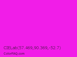 CIELab 57.469,90.369,-52.7 Color is a normal magenta color and the nearest color is Hot Magenta #ff1dce. Hex code #f11de8 and RGB value is rgb(241,29,232). In RGB color space, this color is composed of 95% red, 11% green, 91% blue, In CMYK color space, this color is composed of 0% cyan, 88% magenta, 4% yellow , 5% black , In HSL color space, this color has a hue angle of 303° , 88% saturation and 53% lightness.