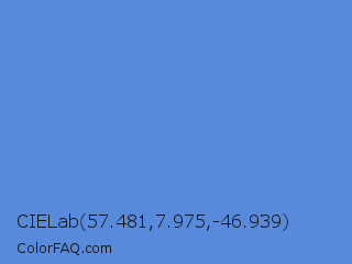 CIELab 57.481,7.975,-46.939 Color is a normal blue color and the nearest color is Havelock Blue #5590d9. Hex code #588adc and RGB value is rgb(88,138,220). In RGB color space, this color is composed of 35% red, 54% green, 86% blue, In CMYK color space, this color is composed of 60% cyan, 37% magenta, 0% yellow , 14% black , In HSL color space, this color has a hue angle of 217° , 65% saturation and 60% lightness.