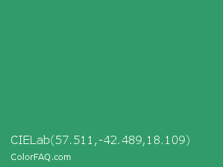 CIELab 57.511,-42.489,18.109 Color is a normal green color and the nearest color is Illuminating Emerald #319177. Hex code #319c69 and RGB value is rgb(49,156,105). In RGB color space, this color is composed of 19% red, 61% green, 41% blue, In CMYK color space, this color is composed of 69% cyan, 0% magenta, 33% yellow , 39% black , In HSL color space, this color has a hue angle of 151° , 52% saturation and 40% lightness.