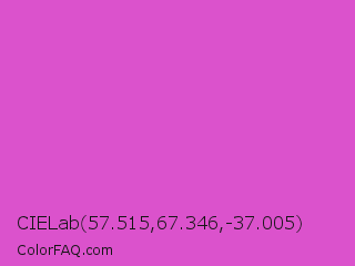 CIELab 57.515,67.346,-37.005 Color is a normal magenta color and the nearest color is Fuchsia Pink #c154c1. Hex code #db52cc and RGB value is rgb(219,82,204). In RGB color space, this color is composed of 86% red, 32% green, 80% blue, In CMYK color space, this color is composed of 0% cyan, 63% magenta, 7% yellow , 14% black , In HSL color space, this color has a hue angle of 307° , 66% saturation and 59% lightness.