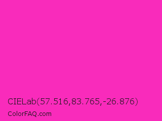 CIELab 57.516,83.765,-26.876 Color is a normal magenta color and the nearest color is Razzle Dazzle Rose #ff33cc. Hex code #f92bbb and RGB value is rgb(249,43,187). In RGB color space, this color is composed of 98% red, 17% green, 73% blue, In CMYK color space, this color is composed of 0% cyan, 83% magenta, 25% yellow , 2% black , In HSL color space, this color has a hue angle of 318° , 94% saturation and 57% lightness.