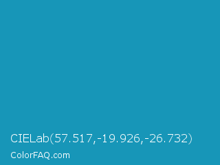 CIELab 57.517,-19.926,-26.732 Color is a normal cyan color and the nearest color is Blue Green #0d98ba. Hex code #1796b8 and RGB value is rgb(23,150,184). In RGB color space, this color is composed of 9% red, 59% green, 72% blue, In CMYK color space, this color is composed of 88% cyan, 18% magenta, 0% yellow , 28% black , In HSL color space, this color has a hue angle of 193° , 78% saturation and 41% lightness.