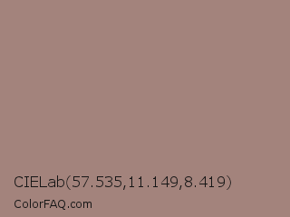 CIELab 57.535,11.149,8.419 Color is a normal red color and the nearest color is Pharlap #a3807b. Hex code #a3837c and RGB value is rgb(163,131,124). In RGB color space, this color is composed of 64% red, 51% green, 49% blue, In CMYK color space, this color is composed of 0% cyan, 20% magenta, 24% yellow , 36% black , In HSL color space, this color has a hue angle of 11° , 17% saturation and 56% lightness.