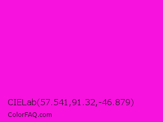 CIELab 57.541,91.32,-46.879 Color is a normal magenta color and the nearest color is Hot Magenta #ff1dce. Hex code #f712de and RGB value is rgb(247,18,222). In RGB color space, this color is composed of 97% red, 7% green, 87% blue, In CMYK color space, this color is composed of 0% cyan, 93% magenta, 10% yellow , 3% black , In HSL color space, this color has a hue angle of 307° , 93% saturation and 52% lightness.