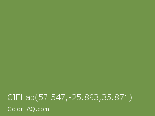 CIELab 57.547,-25.893,35.871 Color is a normal green color and the nearest color is Palm Leaf #6f9940. Hex code #719549 and RGB value is rgb(113,149,73). In RGB color space, this color is composed of 44% red, 58% green, 29% blue, In CMYK color space, this color is composed of 24% cyan, 0% magenta, 51% yellow , 42% black , In HSL color space, this color has a hue angle of 88° , 34% saturation and 44% lightness.