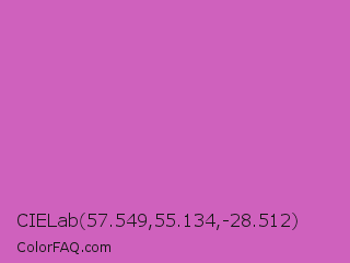 CIELab 57.549,55.134,-28.512 Color is a normal magenta color and the nearest color is Fuchsia Pink #c154c1. Hex code #cf61bd and RGB value is rgb(207,97,189). In RGB color space, this color is composed of 81% red, 38% green, 74% blue, In CMYK color space, this color is composed of 0% cyan, 53% magenta, 9% yellow , 19% black , In HSL color space, this color has a hue angle of 310° , 53% saturation and 60% lightness.