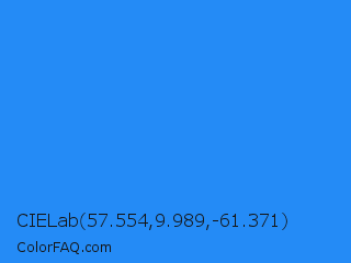 CIELab 57.554,9.989,-61.371 Color is a normal blue color and the nearest color is Dodger Blue #1e90ff. Hex code #248bf6 and RGB value is rgb(36,139,246). In RGB color space, this color is composed of 14% red, 55% green, 96% blue, In CMYK color space, this color is composed of 85% cyan, 43% magenta, 0% yellow , 4% black , In HSL color space, this color has a hue angle of 211° , 92% saturation and 55% lightness.