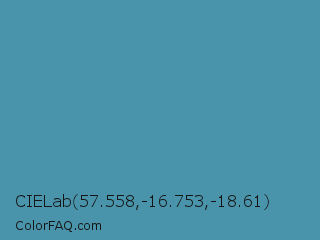 CIELab 57.558,-16.753,-18.61 Color is a normal blue color and the nearest color is Hippie Blue #589aaf. Hex code #4994aa and RGB value is rgb(73,148,170). In RGB color space, this color is composed of 29% red, 58% green, 67% blue, In CMYK color space, this color is composed of 57% cyan, 13% magenta, 0% yellow , 33% black , In HSL color space, this color has a hue angle of 194° , 40% saturation and 48% lightness.