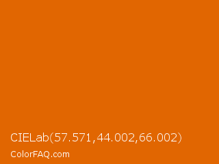 CIELab 57.571,44.002,66.002 Color is a normal orange color and the nearest color is Bamboo #da6304. Hex code #e16601 and RGB value is rgb(225,102,1). In RGB color space, this color is composed of 88% red, 40% green, 0% blue, In CMYK color space, this color is composed of 0% cyan, 55% magenta, 100% yellow , 12% black , In HSL color space, this color has a hue angle of 27° , 99% saturation and 44% lightness.