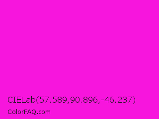 CIELab 57.589,90.896,-46.237 Color is a normal magenta color and the nearest color is Hot Magenta #ff1dce. Hex code #f715dd and RGB value is rgb(247,21,221). In RGB color space, this color is composed of 97% red, 8% green, 87% blue, In CMYK color space, this color is composed of 0% cyan, 91% magenta, 11% yellow , 3% black , In HSL color space, this color has a hue angle of 307° , 93% saturation and 53% lightness.