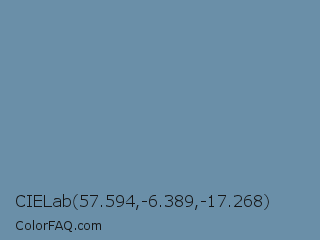 CIELab 57.594,-6.389,-17.268 Color is a normal blue color and the nearest color is Bermuda Gray #6b8ba2. Hex code #6a8fa8 and RGB value is rgb(106,143,168). In RGB color space, this color is composed of 42% red, 56% green, 66% blue, In CMYK color space, this color is composed of 37% cyan, 15% magenta, 0% yellow , 34% black , In HSL color space, this color has a hue angle of 204° , 26% saturation and 54% lightness.