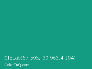 CIELab 57.595,-39.963,4.104 Color is a normal cyan color and the nearest color is Gossamer #069b81. Hex code #149c82 and RGB value is rgb(20,156,130). In RGB color space, this color is composed of 8% red, 61% green, 51% blue, In CMYK color space, this color is composed of 87% cyan, 0% magenta, 17% yellow , 39% black , In HSL color space, this color has a hue angle of 169° , 77% saturation and 35% lightness.