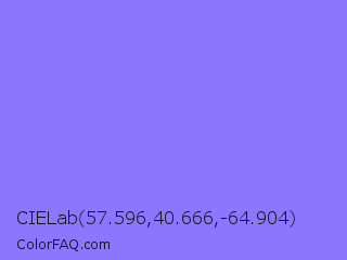 CIELab 57.596,40.666,-64.904 Color is a light indigo color and the nearest color is Medium Slate Blue #7b68ee. Hex code #8b76fd and RGB value is rgb(139,118,253). In RGB color space, this color is composed of 55% red, 46% green, 99% blue, In CMYK color space, this color is composed of 45% cyan, 53% magenta, 0% yellow , 1% black , In HSL color space, this color has a hue angle of 249° , 97% saturation and 73% lightness.