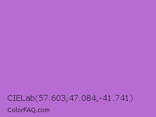 CIELab 57.603,47.084,-41.741 Color is a light purple color and the nearest color is Rich Lilac #b666d2. Hex code #b76cd4 and RGB value is rgb(183,108,212). In RGB color space, this color is composed of 72% red, 42% green, 83% blue, In CMYK color space, this color is composed of 14% cyan, 49% magenta, 0% yellow , 17% black , In HSL color space, this color has a hue angle of 283° , 55% saturation and 63% lightness.