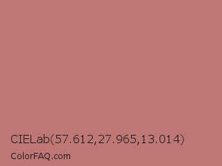CIELab 57.612,27.965,13.014 Color is a normal red color and the nearest color is Rose Gold #b76e79. Hex code #bf7775 and RGB value is rgb(191,119,117). In RGB color space, this color is composed of 75% red, 47% green, 46% blue, In CMYK color space, this color is composed of 0% cyan, 38% magenta, 39% yellow , 25% black , In HSL color space, this color has a hue angle of 2° , 37% saturation and 60% lightness.