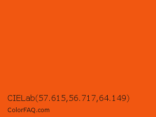 CIELab 57.615,56.717,64.149 Color is a normal orange color and the nearest color is Orioles Orange #fb4f14. Hex code #f15711 and RGB value is rgb(241,87,17). In RGB color space, this color is composed of 95% red, 34% green, 7% blue, In CMYK color space, this color is composed of 0% cyan, 64% magenta, 93% yellow , 5% black , In HSL color space, this color has a hue angle of 19° , 89% saturation and 51% lightness.