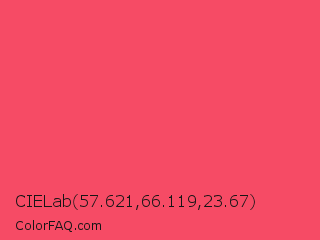 CIELab 57.621,66.119,23.67 Color is a light red color and the nearest color is Magic Potion #ff4466. Hex code #f64b65 and RGB value is rgb(246,75,101). In RGB color space, this color is composed of 96% red, 29% green, 40% blue, In CMYK color space, this color is composed of 0% cyan, 70% magenta, 59% yellow , 4% black , In HSL color space, this color has a hue angle of 351° , 90% saturation and 63% lightness.