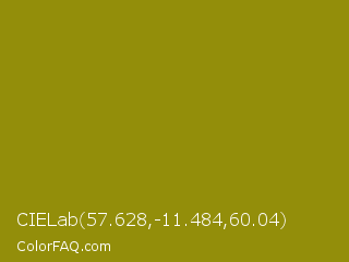 CIELab 57.628,-11.484,60.04 Color is a normal yellow color and the nearest color is Dark Yellow #9b870c. Hex code #938e0a and RGB value is rgb(147,142,10). In RGB color space, this color is composed of 58% red, 56% green, 4% blue, In CMYK color space, this color is composed of 0% cyan, 3% magenta, 93% yellow , 42% black , In HSL color space, this color has a hue angle of 58° , 87% saturation and 31% lightness.