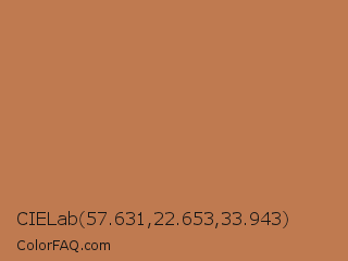 CIELab 57.631,22.653,33.943 Color is a normal orange color and the nearest color is Deer #ba8759. Hex code #bf7a50 and RGB value is rgb(191,122,80). In RGB color space, this color is composed of 75% red, 48% green, 31% blue, In CMYK color space, this color is composed of 0% cyan, 36% magenta, 58% yellow , 25% black , In HSL color space, this color has a hue angle of 23° , 46% saturation and 53% lightness.