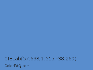 CIELab 57.638,1.515,-38.269 Color is a normal blue color and the nearest color is Danube #6093d1. Hex code #598dcd and RGB value is rgb(89,141,205). In RGB color space, this color is composed of 35% red, 55% green, 80% blue, In CMYK color space, this color is composed of 57% cyan, 31% magenta, 0% yellow , 20% black , In HSL color space, this color has a hue angle of 213° , 54% saturation and 58% lightness.