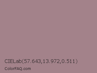 CIELab 57.643,13.972,0.511 Color is a normal red color and the nearest color is Mountbatten Pink #997a8d. Hex code #a3828a and RGB value is rgb(163,130,138). In RGB color space, this color is composed of 64% red, 51% green, 54% blue, In CMYK color space, this color is composed of 0% cyan, 20% magenta, 15% yellow , 36% black , In HSL color space, this color has a hue angle of 345° , 15% saturation and 57% lightness.
