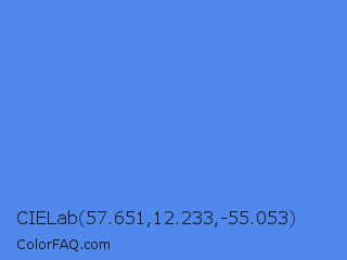 CIELab 57.651,12.233,-55.053 Color is a light blue color and the nearest color is Blueberry #4f86f7. Hex code #5089eb and RGB value is rgb(80,137,235). In RGB color space, this color is composed of 31% red, 54% green, 92% blue, In CMYK color space, this color is composed of 66% cyan, 42% magenta, 0% yellow , 8% black , In HSL color space, this color has a hue angle of 218° , 79% saturation and 62% lightness.
