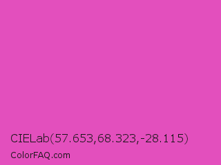 CIELab 57.653,68.323,-28.115 Color is a normal magenta color and the nearest color is Brilliant Rose #f653a6. Hex code #e34fbd and RGB value is rgb(227,79,189). In RGB color space, this color is composed of 89% red, 31% green, 74% blue, In CMYK color space, this color is composed of 0% cyan, 65% magenta, 17% yellow , 11% black , In HSL color space, this color has a hue angle of 315° , 73% saturation and 60% lightness.