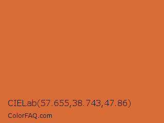 CIELab 57.655,38.743,47.86 Color is a normal orange color and the nearest color is Red Damask #da6a41. Hex code #d86c37 and RGB value is rgb(216,108,55). In RGB color space, this color is composed of 85% red, 42% green, 22% blue, In CMYK color space, this color is composed of 0% cyan, 50% magenta, 75% yellow , 15% black , In HSL color space, this color has a hue angle of 20° , 67% saturation and 53% lightness.