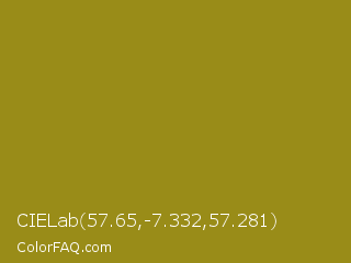 CIELab 57.65,-7.332,57.281 Color is a normal yellow color and the nearest color is Hacienda #98811b. Hex code #998c18 and RGB value is rgb(153,140,24). In RGB color space, this color is composed of 60% red, 55% green, 9% blue, In CMYK color space, this color is composed of 0% cyan, 8% magenta, 84% yellow , 40% black , In HSL color space, this color has a hue angle of 54° , 73% saturation and 35% lightness.
