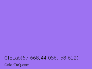 CIELab 57.668,44.056,-58.612 Color is a light indigo color and the nearest color is Medium Purple #9370db. Hex code #9d72f2 and RGB value is rgb(157,114,242). In RGB color space, this color is composed of 62% red, 45% green, 95% blue, In CMYK color space, this color is composed of 35% cyan, 53% magenta, 0% yellow , 5% black , In HSL color space, this color has a hue angle of 260° , 83% saturation and 70% lightness.