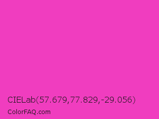 CIELab 57.679,77.829,-29.056 Color is a normal magenta color and the nearest color is Razzle Dazzle Rose #ff33cc. Hex code #f03dbf and RGB value is rgb(240,61,191). In RGB color space, this color is composed of 94% red, 24% green, 75% blue, In CMYK color space, this color is composed of 0% cyan, 75% magenta, 20% yellow , 6% black , In HSL color space, this color has a hue angle of 316° , 86% saturation and 59% lightness.
