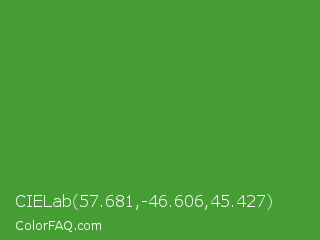 CIELab 57.681,-46.606,45.427 Color is a normal green color and the nearest color is Apple #4fa83d. Hex code #459d34 and RGB value is rgb(69,157,52). In RGB color space, this color is composed of 27% red, 62% green, 20% blue, In CMYK color space, this color is composed of 56% cyan, 0% magenta, 67% yellow , 38% black , In HSL color space, this color has a hue angle of 110° , 50% saturation and 41% lightness.