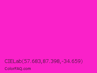 CIELab 57.683,87.398,-34.659 Color is a normal magenta color and the nearest color is Hot Magenta #ff1dce. Hex code #fa21c9 and RGB value is rgb(250,33,201). In RGB color space, this color is composed of 98% red, 13% green, 79% blue, In CMYK color space, this color is composed of 0% cyan, 87% magenta, 20% yellow , 2% black , In HSL color space, this color has a hue angle of 314° , 96% saturation and 55% lightness.