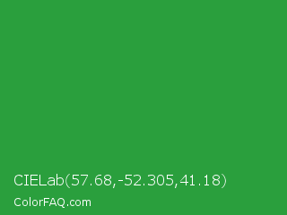 CIELab 57.68,-52.305,41.18 Color is a normal green color and the nearest color is Wageningen Green #34b233. Hex code #2a9f3d and RGB value is rgb(42,159,61). In RGB color space, this color is composed of 16% red, 62% green, 24% blue, In CMYK color space, this color is composed of 74% cyan, 0% magenta, 62% yellow , 38% black , In HSL color space, this color has a hue angle of 130° , 58% saturation and 39% lightness.