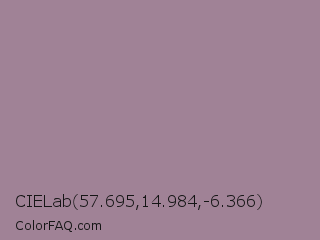 CIELab 57.695,14.984,-6.366 Color is a normal magenta color and the nearest color is Mountbatten Pink #997a8d. Hex code #a08296 and RGB value is rgb(160,130,150). In RGB color space, this color is composed of 63% red, 51% green, 59% blue, In CMYK color space, this color is composed of 0% cyan, 19% magenta, 6% yellow , 37% black , In HSL color space, this color has a hue angle of 320° , 14% saturation and 57% lightness.