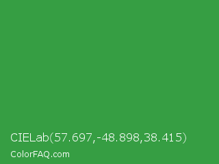 CIELab 57.697,-48.898,38.415 Color is a normal green color and the nearest color is May Green #4c9141. Hex code #369e43 and RGB value is rgb(54,158,67). In RGB color space, this color is composed of 21% red, 62% green, 26% blue, In CMYK color space, this color is composed of 66% cyan, 0% magenta, 58% yellow , 38% black , In HSL color space, this color has a hue angle of 128° , 49% saturation and 42% lightness.