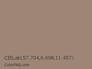 CIELab 57.704,6.698,11.457 Color is a normal orange color and the nearest color is Beaver #9f8170. Hex code #9e8677 and RGB value is rgb(158,134,119). In RGB color space, this color is composed of 62% red, 53% green, 47% blue, In CMYK color space, this color is composed of 0% cyan, 15% magenta, 25% yellow , 38% black , In HSL color space, this color has a hue angle of 23° , 17% saturation and 54% lightness.