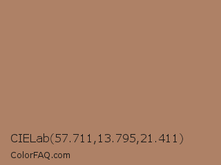 CIELab 57.711,13.795,21.411 Color is a normal orange color and the nearest color is Light Taupe #b38b6d. Hex code #ae8166 and RGB value is rgb(174,129,102). In RGB color space, this color is composed of 68% red, 51% green, 40% blue, In CMYK color space, this color is composed of 0% cyan, 26% magenta, 41% yellow , 32% black , In HSL color space, this color has a hue angle of 23° , 31% saturation and 54% lightness.