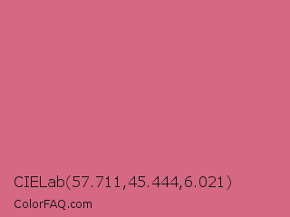 CIELab 57.711,45.444,6.021 Color is a light red color and the nearest color is Cinnamon Satin #cd607e. Hex code #d56882 and RGB value is rgb(213,104,130). In RGB color space, this color is composed of 84% red, 41% green, 51% blue, In CMYK color space, this color is composed of 0% cyan, 51% magenta, 39% yellow , 16% black , In HSL color space, this color has a hue angle of 346° , 56% saturation and 62% lightness.