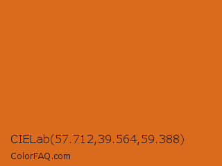 CIELab 57.712,39.564,59.388 Color is a normal orange color and the nearest color is Hot Cinnamon #d2691e. Hex code #db6b1c and RGB value is rgb(219,107,28). In RGB color space, this color is composed of 86% red, 42% green, 11% blue, In CMYK color space, this color is composed of 0% cyan, 51% magenta, 87% yellow , 14% black , In HSL color space, this color has a hue angle of 25° , 77% saturation and 48% lightness.