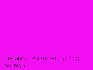 CIELab 57.712,93.381,-57.909 Color is a normal magenta color and the nearest color is Magenta / Fuchsia #ff00ff. Hex code #f210f2 and RGB value is rgb(242,16,242). In RGB color space, this color is composed of 95% red, 6% green, 95% blue, In CMYK color space, this color is composed of 0% cyan, 93% magenta, 0% yellow , 5% black , In HSL color space, this color has a hue angle of 300° , 90% saturation and 51% lightness.