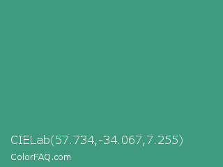 CIELab 57.734,-34.067,7.255 Color is a normal green color and the nearest color is Ocean Green #41aa78. Hex code #409a7d and RGB value is rgb(64,154,125). In RGB color space, this color is composed of 25% red, 60% green, 49% blue, In CMYK color space, this color is composed of 58% cyan, 0% magenta, 19% yellow , 40% black , In HSL color space, this color has a hue angle of 161° , 41% saturation and 43% lightness.