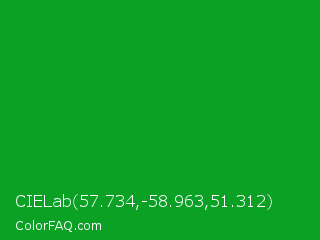 CIELab 57.734,-58.963,51.312 Color is a normal green color and the nearest color is North Texas Green #059033. Hex code #0aa124 and RGB value is rgb(10,161,36). In RGB color space, this color is composed of 4% red, 63% green, 14% blue, In CMYK color space, this color is composed of 94% cyan, 0% magenta, 78% yellow , 37% black , In HSL color space, this color has a hue angle of 130° , 88% saturation and 34% lightness.