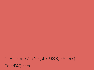 CIELab 57.752,45.983,26.56 Color is a light red color and the nearest color is Roman #de6360. Hex code #dd665f and RGB value is rgb(221,102,95). In RGB color space, this color is composed of 87% red, 40% green, 37% blue, In CMYK color space, this color is composed of 0% cyan, 54% magenta, 57% yellow , 13% black , In HSL color space, this color has a hue angle of 3° , 65% saturation and 62% lightness.