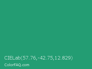 CIELab 57.76,-42.75,12.829 Color is a normal green color and the nearest color is Green Crayola #1cac78. Hex code #239d73 and RGB value is rgb(35,157,115). In RGB color space, this color is composed of 14% red, 62% green, 45% blue, In CMYK color space, this color is composed of 78% cyan, 0% magenta, 27% yellow , 38% black , In HSL color space, this color has a hue angle of 159° , 64% saturation and 38% lightness.