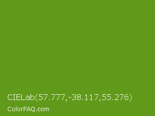CIELab 57.777,-38.117,55.276 Color is a normal green color and the nearest color is Christi #67a712. Hex code #619a1a and RGB value is rgb(97,154,26). In RGB color space, this color is composed of 38% red, 60% green, 10% blue, In CMYK color space, this color is composed of 37% cyan, 0% magenta, 83% yellow , 40% black , In HSL color space, this color has a hue angle of 87° , 71% saturation and 35% lightness.