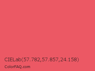 CIELab 57.782,57.857,24.158 Color is a light red color and the nearest color is Mandy #e25465. Hex code #ec5864 and RGB value is rgb(236,88,100). In RGB color space, this color is composed of 93% red, 35% green, 39% blue, In CMYK color space, this color is composed of 0% cyan, 63% magenta, 58% yellow , 7% black , In HSL color space, this color has a hue angle of 355° , 80% saturation and 64% lightness.