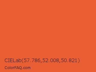 CIELab 57.786,52.008,50.821 Color is a normal red color and the nearest color is Deep Carrot Orange #e9692c. Hex code #ea5e33 and RGB value is rgb(234,94,51). In RGB color space, this color is composed of 92% red, 37% green, 20% blue, In CMYK color space, this color is composed of 0% cyan, 60% magenta, 78% yellow , 8% black , In HSL color space, this color has a hue angle of 14° , 81% saturation and 56% lightness.
