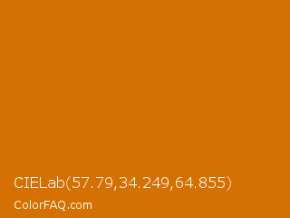 CIELab 57.79,34.249,64.855 Color is a normal orange color and the nearest color is Bamboo #da6304. Hex code #d57003 and RGB value is rgb(213,112,3). In RGB color space, this color is composed of 84% red, 44% green, 1% blue, In CMYK color space, this color is composed of 0% cyan, 47% magenta, 99% yellow , 16% black , In HSL color space, this color has a hue angle of 31° , 97% saturation and 42% lightness.
