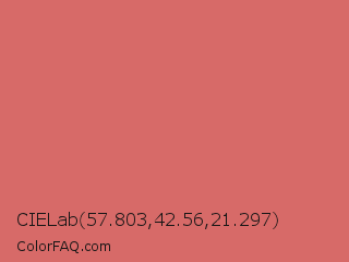 CIELab 57.803,42.56,21.297 Color is a light red color and the nearest color is Sunglo #e16865. Hex code #d76a68 and RGB value is rgb(215,106,104). In RGB color space, this color is composed of 84% red, 42% green, 41% blue, In CMYK color space, this color is composed of 0% cyan, 51% magenta, 52% yellow , 16% black , In HSL color space, this color has a hue angle of 1° , 58% saturation and 63% lightness.